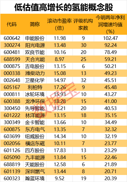 上述低估值個股哪些未來具備高增長潛力?根據5家以上機構一致預測,21只氫能源概念股今后兩年凈利潤增速均值有望超過20%。2只千億市值的行業龍頭入圍其中,包括陽光電源、濰柴動力。