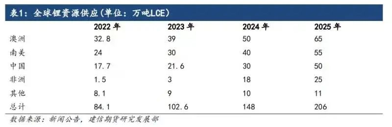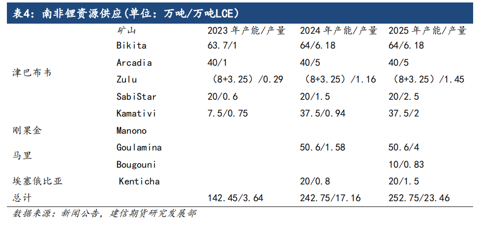 2023年非洲鋰礦投產主要集中在津巴布韋,2024-2025年剛果金、馬里、埃塞俄比亞還有鋰礦山陸續投產,其中剛果金的馬諾諾大型鋰礦的投產將帶動非洲鋰礦產能大幅增加。整體上2023年非洲鋰礦產量預計將達到3.64萬噸LCE,2024-2025年產量預計將分別增加至17.16萬噸、23.46萬噸;