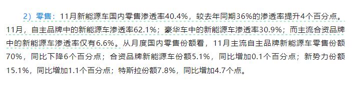乘聯會統計,11 月,新能源乘用車國內零售滲透率 40.4%,首次突破 40%。