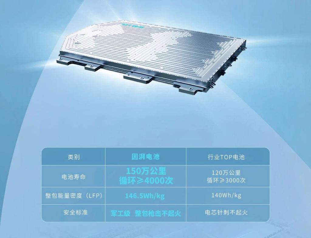 官方披露,因湃電池是磷酸鐵鋰電池,電池壽命 150 萬公里(循環≥ 4000 次),整包能量密度 146.5Wh/kg。