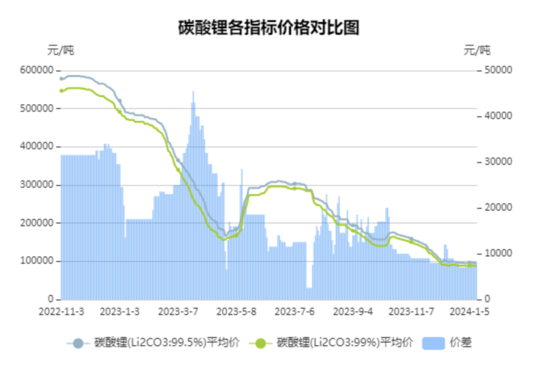 1月8日,電池級碳酸鋰價格跌破10萬元/噸大關。