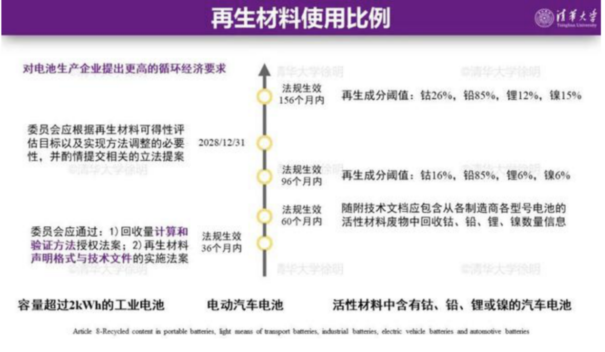 涉及原材料最低回收率方面,歐盟的《電池與廢電池法規》第八條規定:到2030年,鈷、鉛、鋰、鎳再生原材料含量占比分別達到12%、85%、4%、4%;到2035年則提升至20%、85%、10%、12%。