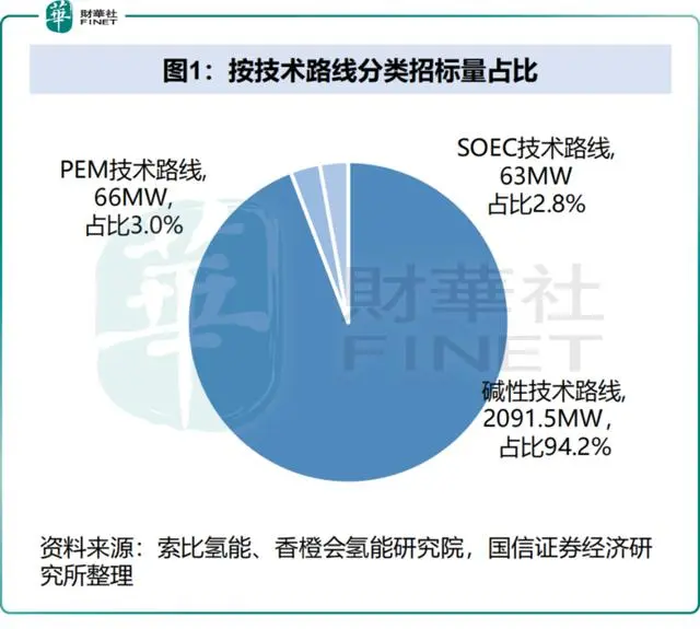 據(jù)索比氫能、香橙會氫能研究院統(tǒng)計(jì),自2023年以來國內(nèi)共計(jì)29個電解槽項(xiàng)目招標(biāo),招標(biāo)規(guī)模累計(jì)超過2220.5MW。其中,堿性電解槽路線2091.5MW,占比達(dá)94.2%;PEM技術(shù)路線66MW,占比3%;SOEC技術(shù)路線63MW,占比2.8%。