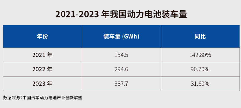 如果拉長(zhǎng)時(shí)間來(lái)看,2021-2023年,我國(guó)動(dòng)力電池裝車量依次為154.5GWh、294.6GWh、387.7GWh,逐年走高,不過,增速是在逐年放緩。