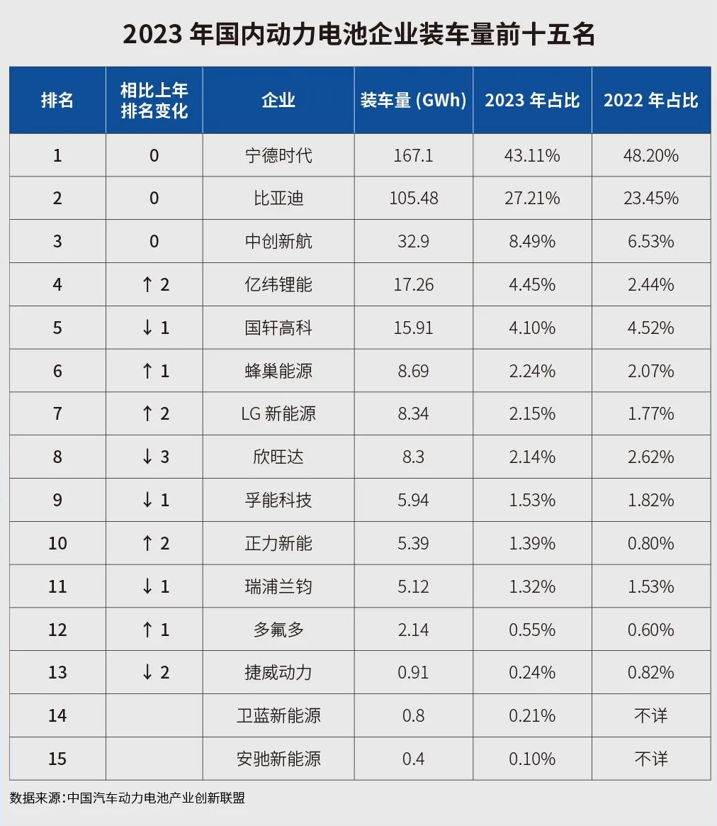 2023年,我國(guó)動(dòng)力電池裝車量前15名依次是:寧德時(shí)代、比亞迪、中創(chuàng)新航、億緯鋰能、國(guó)軒高科、蜂巢能源、LG新能源、欣旺達(dá)、孚能科技、正力新能、瑞浦蘭鈞、多氟多、捷威動(dòng)力、衛(wèi)藍(lán)新能源、安馳新能源。