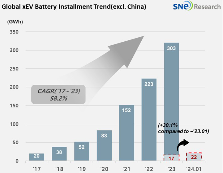 3月8日,韓國能源市場調研機構SNE Research發布統計結果顯示,今年1月在除中國以外全球市場銷售的純電動汽車、插電式混合動力車、混合動力車搭載的電池總量較去年同期增加43.2%,達到319.4千兆瓦時(GWh)。