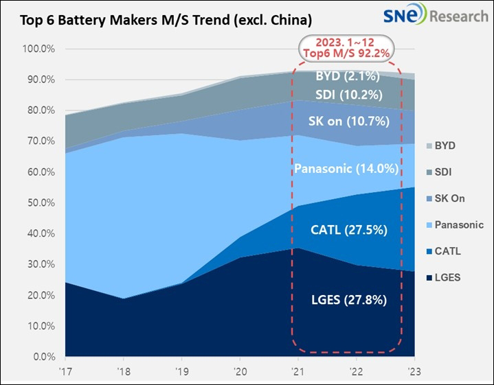 除中國以外的全球電動汽車電池市場上,各大電池制造商市占率變化 圖片來源:SNE Research