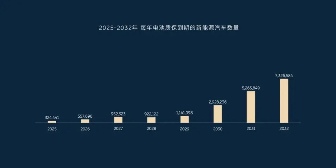 2025年,“脫保”電車將達到32萬輛,2028年達到98萬輛,而2032年將直接飆升至720萬輛。也即,未來的8年時間內,我國動力電池質保到期的產品將累計突破千萬級,逼近2000萬輛。