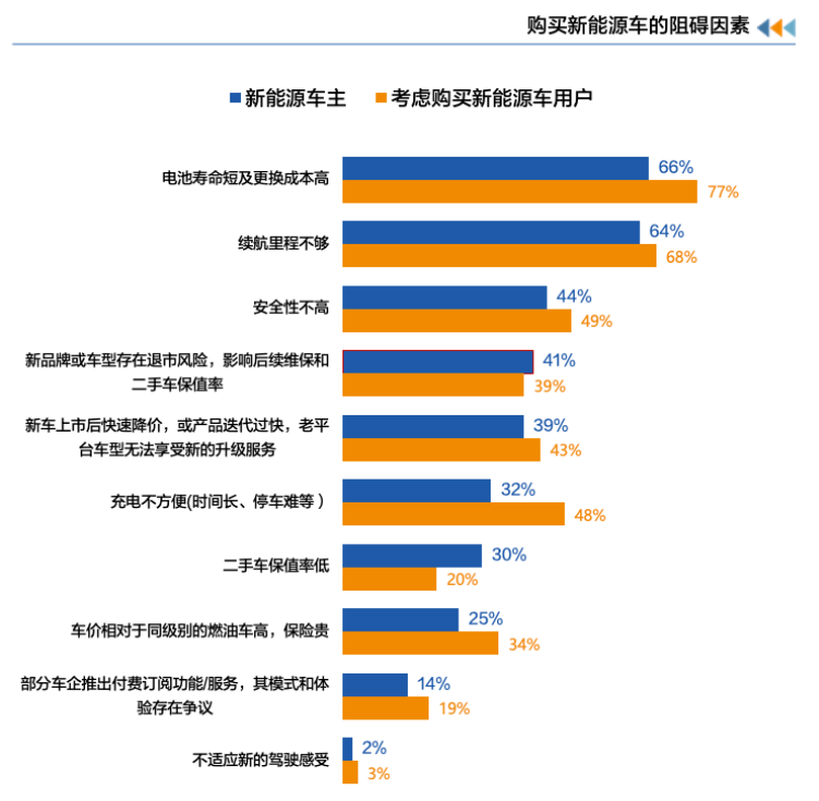 按照汽車之家研究院的《2024年新能源汽車用戶用車焦慮洞察報告》的調查數據,當下阻礙消費者購買新能源的主要因素有三:電池未來的更換成本高、續航里程不足以及對安全性能的疑慮。