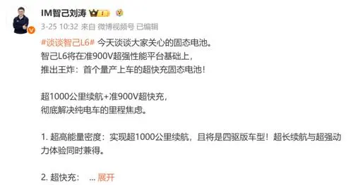 3月25日,智己聯(lián)席CEO劉濤在微博上稱,“智己L6將推出首個量產(chǎn)上車的超快充固態(tài)電池。”他尤其提到“準900V超快充固態(tài)電池”“實現(xiàn)超1000公里續(xù)航”等關(guān)鍵信息。