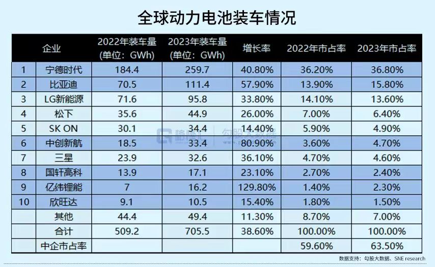 電池前十大廠商中,中國企業占了六席,剩下四席為日韓企業包攬。而六家中國企業里,前二寧德時代、比亞迪,以及中創新航(第六)和億緯鋰能(第九)四家市占率顯示出了提升。