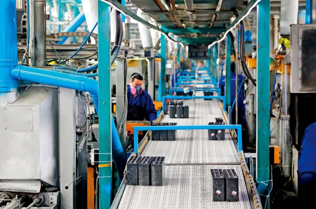 河北邢臺市新河縣一家電池企業內,工作人員在生產線上加工電池。新河縣打造新型電池產業基地,引進廢鉛酸電池回收、處置項目,延伸電池“生產—回收—再生”的綠色循環產業鏈。圖/新華