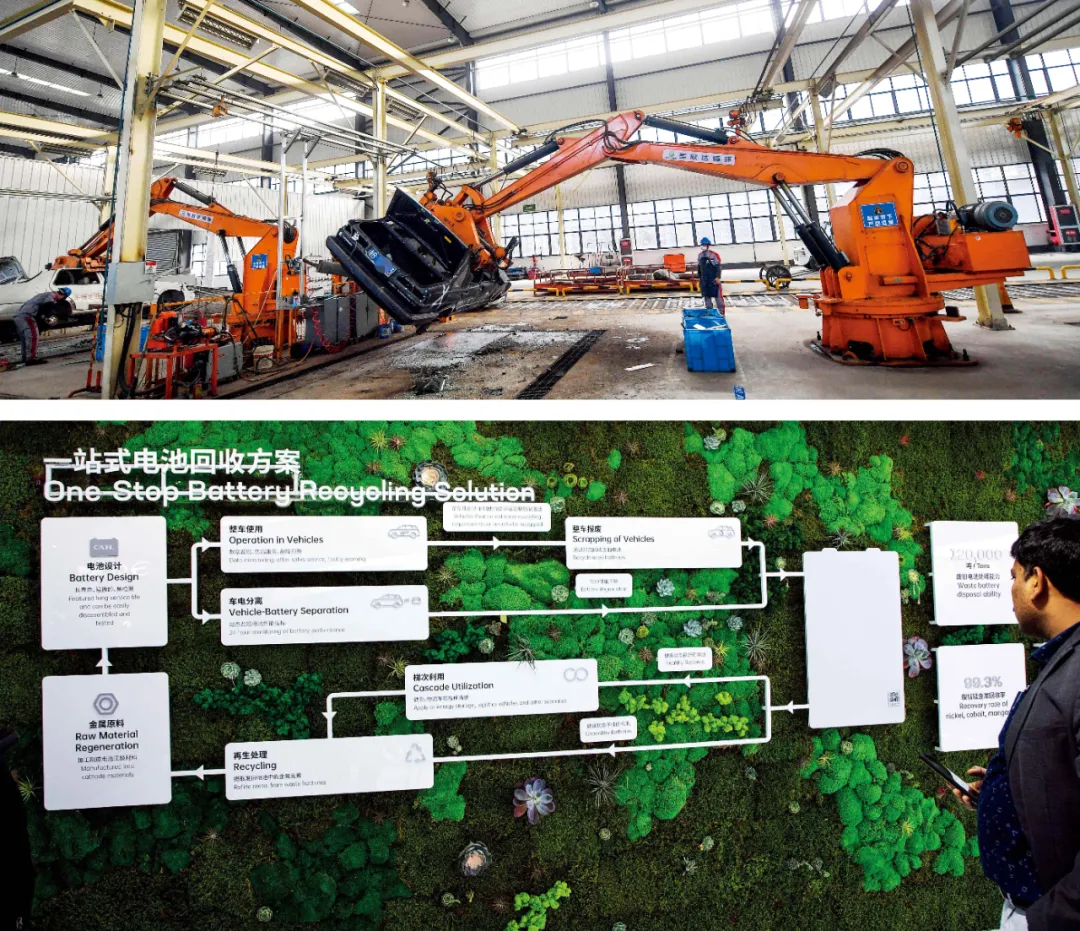 下圖:2023年4月,在上海車展期間,寧德時代展示的一站式電池回收方案。圖/視覺中國