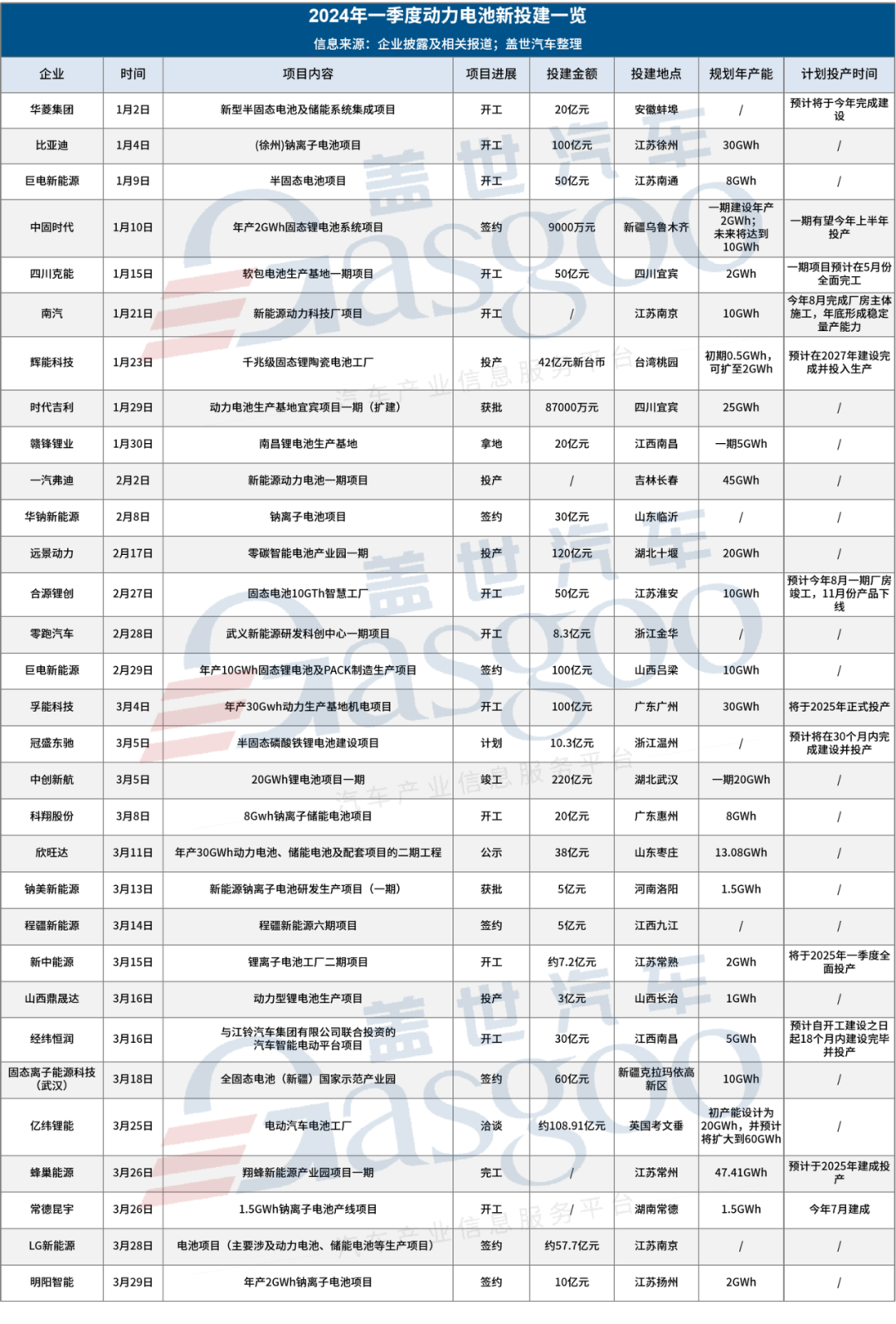 進入2024年,動力電池產業掀起新一輪開工擴產潮。據蓋世汽車不完全統計,今年一季度,動力電池企業在國內外新投建項目共計31個,總投資金額超1234億元,規劃動力電池產能超328GWh。
