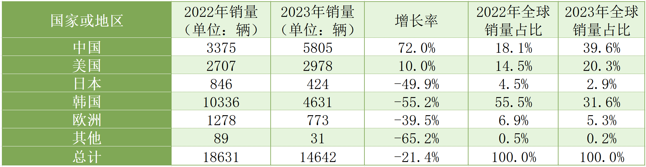 韓國氫能源汽車銷量則從2022年的10336輛一路下滑至2023年的4631輛,跌幅高達(dá)55.2%。中韓日美歐五大主要市場中,只有中國和美國氫能源汽車銷量在上漲。
