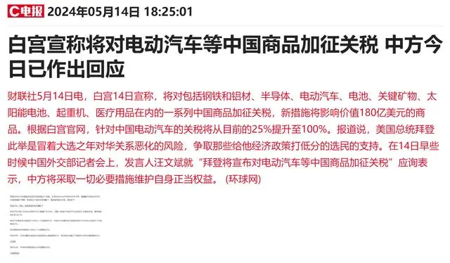 電池、港口起重機、醫療用品在內的一系列中國商品加征關稅,新措施將影響價值180億美元的商品。根據白宮官網,針對中國電動汽車的關稅將從目前的25%提升至100%。