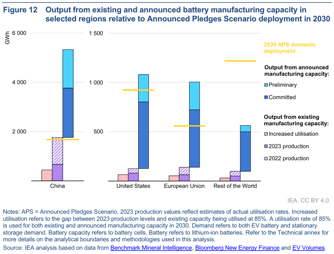 中國未來超過40%的制造能力依賴于現(xiàn)有工廠的擴張;相比之下,美國和歐盟80%的制造能力預(yù)計將來自新工廠,未來幾年將有大量新參與者進入這些市場。目前全球大部分電池制造能力仍集中在當(dāng)今的主要電動汽車市場——中國、美國和歐盟——這些市場都將有足夠的能力實現(xiàn)其宣布的2030年承諾。