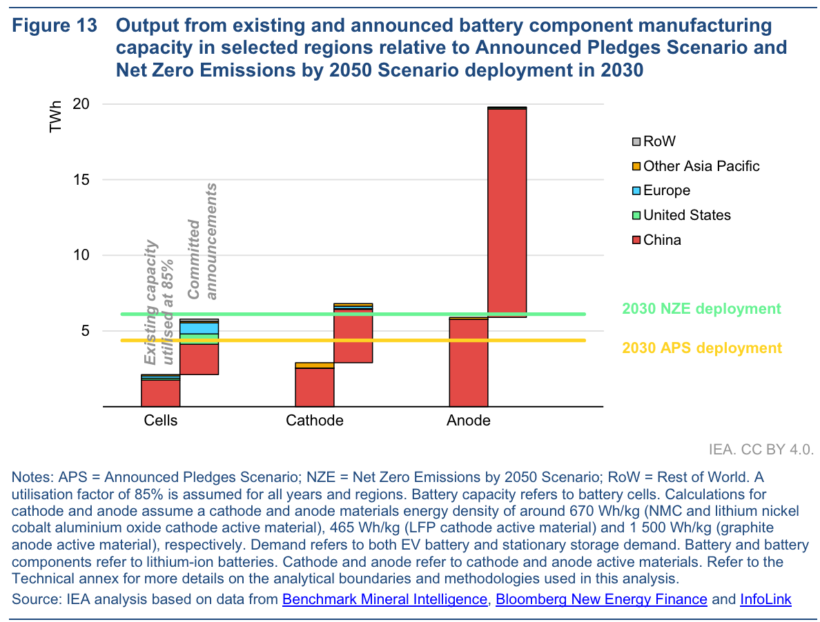 鋰離子電池的制造需要穩(wěn)定、高質(zhì)量的陰極和陽極材料供應(yīng)。它們的生產(chǎn)主要集中在中國,目前中國的陰極活性材料產(chǎn)能占全球產(chǎn)能的近90%,陽極活性材料產(chǎn)能超過97%。到2030年,中國仍占陰極和陽極活性材料承諾新增產(chǎn)能和初步新增產(chǎn)能的85%以上。然而,不同的電池化學(xué)成分需要不同的供應(yīng)鏈,磷酸鐵鋰(LFP)技術(shù)主導(dǎo)著中國市場,鎳錳鈷氧化物鋰(NMC)技術(shù)主導(dǎo)著歐洲和北美市場。中國擁有約100%的LFP產(chǎn)能;占NMC的產(chǎn)能四分之三,其次是韓國,約占20%。未來幾年,中國制造商面臨的主要挑戰(zhàn)將是找到足夠大的出口市場,以利用其巨大的制造能力盈余,提高目前較低的利潤率,而歐盟和美國等地區(qū)的制造商則需要展示其成本競爭力。不同供應(yīng)商提供的電池和組件的質(zhì)量、成本和特性,以及當(dāng)?shù)睾恳蠛铜h(huán)境、社會和治理(ESG)標(biāo)準的規(guī)定,將是決定這些市場贏家和輸家的關(guān)鍵。