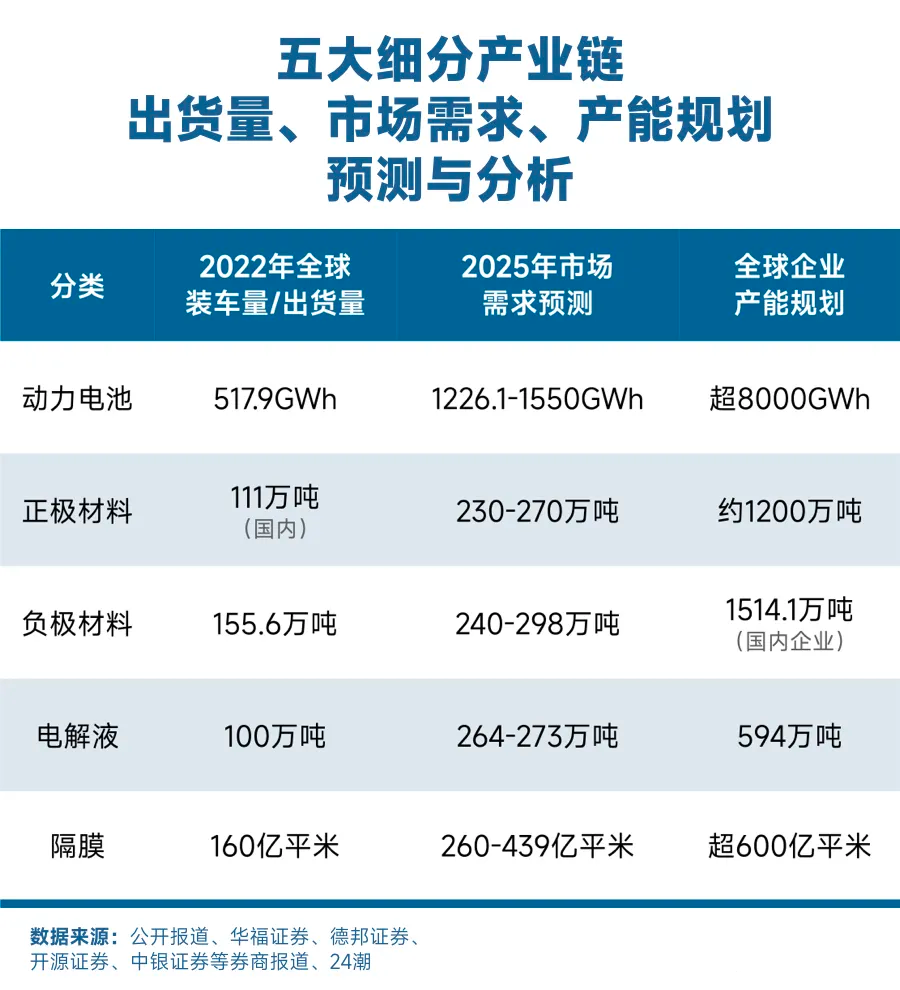 另外,據24潮產業研究院(TTIR)統計的一組數據:截止目前,在動力電池、儲能電池、正極材料、負極材料、電解液與鋰電隔膜這6大核心賽道上,已知的企業產能規劃均遠超2025年第三方研究機構對市場需求的預測上限,未來三年內出現嚴重產能過剩似乎已經不可避免。