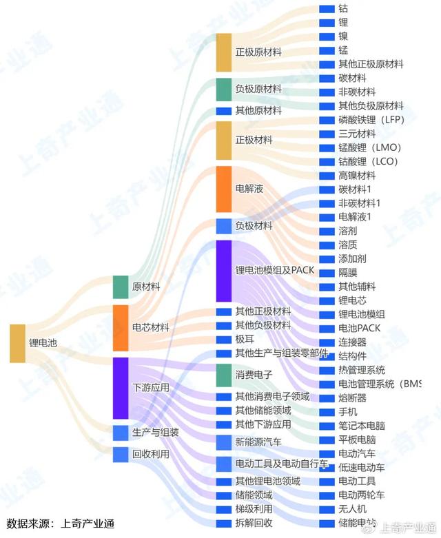 根據(jù)上奇產(chǎn)業(yè)通,鋰電池產(chǎn)業(yè)由原材料、電芯材料、生產(chǎn)與組裝、下游應(yīng)用、回收利用5個(gè)一級(jí)環(huán)節(jié)構(gòu)成,含21個(gè)二級(jí)環(huán)節(jié)、38個(gè)三級(jí)環(huán)節(jié)。