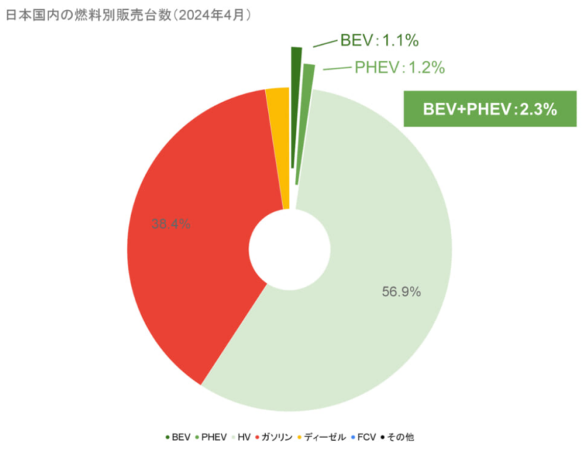 保險數據顯示,中國乘用車市場,2024年4月份滲透率接近36%,達68萬輛,同期日本新能源乘用車銷量5906輛,滲透率僅為2.3%。