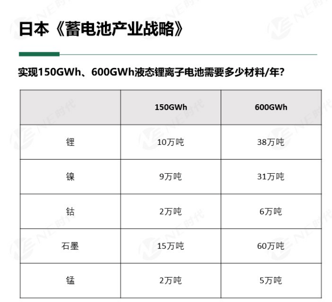 針對150GWh、600GWh液態鋰離子產能,日本以年為單位估算了原材料需求量: