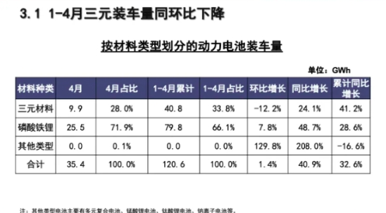 中國汽車動力電池產業(yè)創(chuàng)新聯(lián)盟4月統(tǒng)計數(shù)據(jù)顯示,磷酸鐵鋰電池裝車量占總裝車量71.9%。
