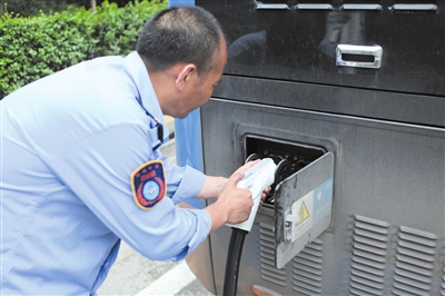 駕駛員李勇正在給純電動(dòng)公交車充電