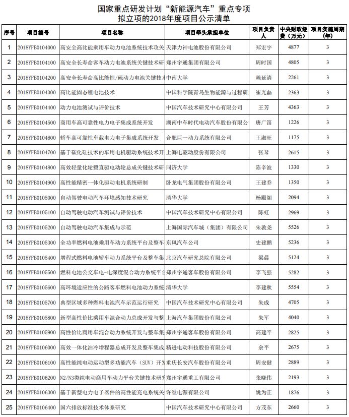 5月7日,科學技術部高技術研究發展中心發布國家重點研發計劃“新能源汽車”重點專項擬立項的2018年度項目公示清單,其中包括安全高比能乘用車動力電池系統技術攻關、高比能固態鋰電池技術、自動駕駛電動汽車測試與評價技術、全功率燃料電池乘用車動力系統平臺及整車等25項重點專項。