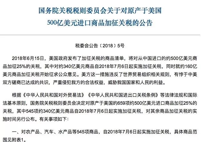6月16日,國(guó)務(wù)院關(guān)稅稅則委員會(huì)發(fā)布關(guān)于對(duì)原產(chǎn)于美國(guó)500億美元進(jìn)口商品加征關(guān)稅的公告,公告表示,鑒于美國(guó)政府在6月15日發(fā)布了加征關(guān)稅的商品清單,將自7月6日起對(duì)從中國(guó)進(jìn)口的約500億美元商品加征25%的關(guān)稅 ,根據(jù)相關(guān)法律法規(guī)的基本原則,國(guó)務(wù)院關(guān)稅稅則委員會(huì)決定對(duì)原產(chǎn)于美國(guó)的659項(xiàng)約500億美元進(jìn)口商品加征25%的關(guān)稅,其中對(duì)農(nóng)產(chǎn)品、汽車(chē)、水產(chǎn)品等545項(xiàng)商品,自2018年7月6日起實(shí)施加征關(guān)稅,對(duì)化工品、醫(yī)療設(shè)備、能源產(chǎn)品等114項(xiàng)商品,加征關(guān)稅實(shí)施時(shí)間另行公告。