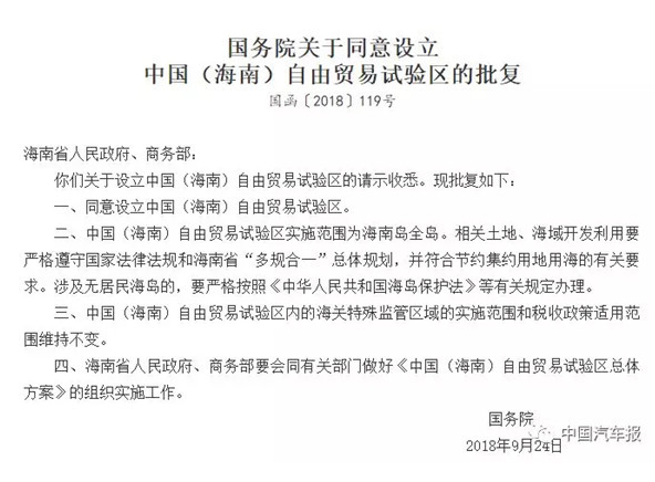 隨后,4月14日,國務(wù)院正式發(fā)布了《關(guān)于支持海南全面深化改革開放的指導(dǎo)意見》(以下簡稱“指導(dǎo)意見”),對上述舉措給予了充分肯定,并表明將賦予海南經(jīng)濟(jì)特區(qū)改革開放自由貿(mào)易試驗區(qū)和中國特色自由貿(mào)易港。同時還將在海南探索共享經(jīng)濟(jì)發(fā)展新模式,在出行、教育、職業(yè)培訓(xùn)等領(lǐng)域開展試點示范。科學(xué)合理控制機動車保有量,加快推廣新能源汽車和節(jié)能環(huán)保汽車,在海南島逐步禁止銷售燃油汽車。