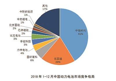 2018年,動力電池“雙雄”寧德時代和比亞迪,兩家企業市場占有率就達到61%,相比2017年同期提升17個百分點,行業龍頭地位凸顯。