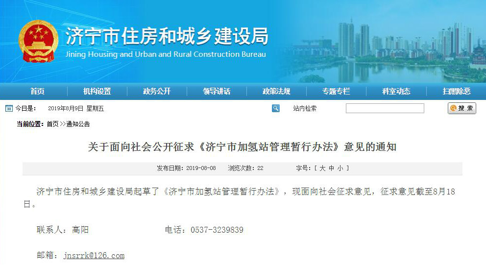 近日,山東濟寧市住房和城鄉(xiāng)建設(shè)局發(fā)布關(guān)于面向社會公開征求《濟寧市加氫站管理暫行辦法》意見的通知。