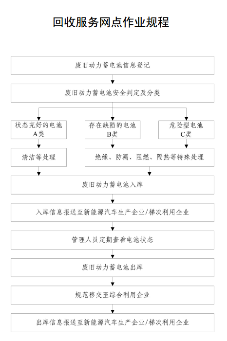4.2 [工作要求]新能源汽車生產及梯次利用等企業應依托回收服務網點加強對本地區廢舊動力蓄電池的跟蹤。回收服務網點負責收集、分類、貯存及包裝廢舊動力蓄電池,不得擅自對收集的廢舊動力蓄電池進行安全檢查外的拆解處理。廢舊動力蓄電池應規范移交至綜合利用企業進行梯次利用或再生利用。