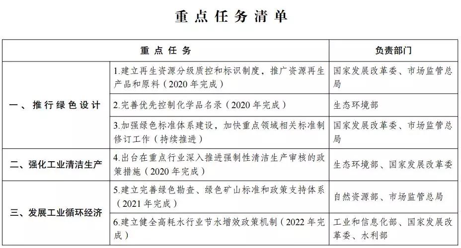 (五)發展工業循環經濟。健全相關支持政策,推動現有產業園區循環化改造和新建園區循環化建設。完善共伴生礦、尾礦、工 業“三廢”、余熱余壓綜合利用的支持政策。以電器電子產品、汽車產品、動力蓄電池、鉛酸蓄電池、飲料紙基復合包裝物為重點,加快落實生產者責任延伸制度,適時將實施范圍拓展至輪胎等品種,強化生產者廢棄產品回收處理責任。支持建立發動機、變速箱 等汽車舊件回收、再制造加工體系,完善機動車報廢更新政策。建立完善綠色勘查、綠色礦山標準和政策支持體系。建立健全高耗水 行業節水增效政策機制。(國家發展改革委、工業和信息化部、自然資源部、生態環境部、水利部、商務部、市場監管總局等按職責 分工負責)