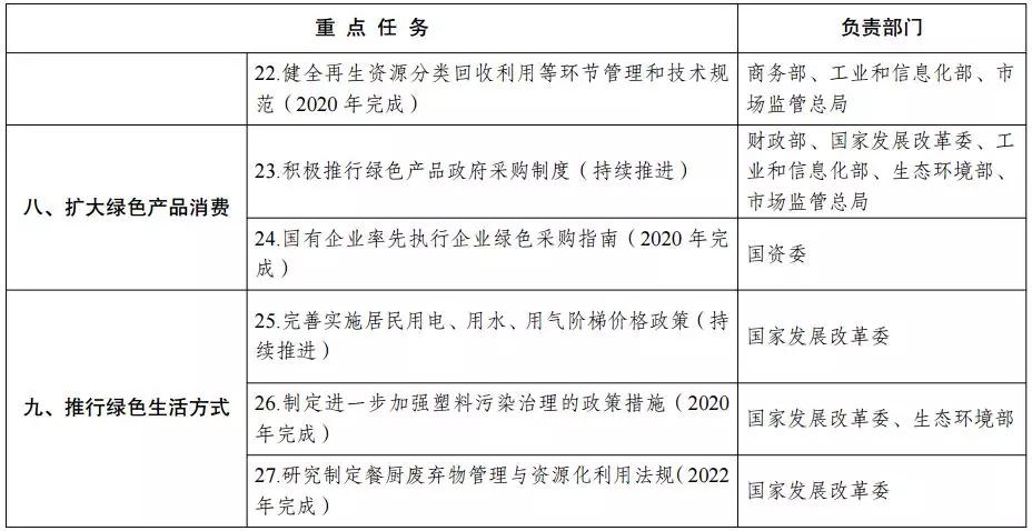 (九)促進服務業綠色發展。在市政公用工程設施和城鄉公共生活服務設施的規劃、建設、運營、管理有關標準和規范制修訂中,全面貫徹綠色發展理念,提升綠色化水平。完善綠色物流建設支持政策。加快建立健全快遞、電子商務、外賣等領域綠色包裝的法律、標準、政策體系,減少過度包裝和一次性用品使用,鼓勵使用可降解、可循環利用的包裝材料、物流器具。健全再生資源分類回收利用等環節管理和技術規范。(住房城鄉建設部、自然資源部、國家 發展改革委、工業和信息化部、司法部、生態環境部、交通運輸部、商務部、市場監管總局、鐵路局、民航局、郵政局等按職責分工負責)