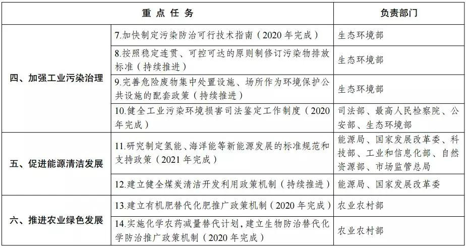 (六)加強工業污染治理。全面推行污染物排放許可制度,強化工業企業污染防治法定責任。加快制定污染防治可行技術指南,按照穩定連貫、可控可達的原則制修訂污染物排放標準,嚴格環境保護執法監督,實現工業污染源全面達標排放,鼓勵達標企業實施深度治理。完善危險廢物集中處置設施、場所作為環境保護公共設施的配套政策。建立健全責任清晰、程序合理、科學規范的生態環境突發事件預警和應急機制,建立生態環境突發事件后評估機制。健全工業污染環境損害司法鑒定工作制度,建立完善行政管理機關、行政執法機關與監察機關、司法機關的銜接配合機制,促進工業污染治理領域處罰信息和監測信息共享,充分發揮檢察機關公益職能作用,形成工業污染治理多元化格局。(最高人民法院、最高人民檢察院、公安部、司法部、生態環境部、工業和信息化部、國 家發展改革委、財政部等按職責分工負責)