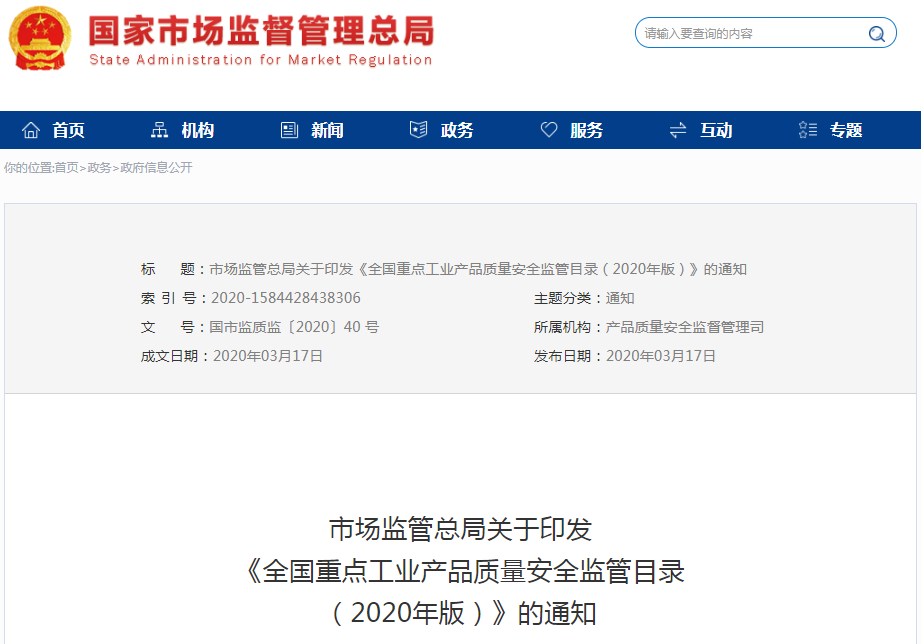 市場(chǎng)監(jiān)管總局關(guān)于印發(fā)《全國(guó)重點(diǎn)工業(yè)產(chǎn)品質(zhì)量安全監(jiān)管目錄(2020年版)》的通知