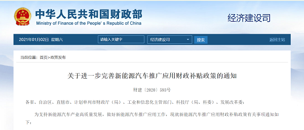 基于上述背景,北京時間2020年12月31日,財政部、工信部等四部門再次發布關于進一步完善新能源汽車推廣應用財政補貼政策的多項通知。其中,通知明確2021年新能源汽車補貼的標準框架及門檻與2020年一致,2021年新能源汽車補貼標準在2020年基礎上退坡20%。