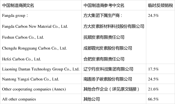 2021年10月15日,歐盟委員會發布公告,對原產于中國的石墨電極系統(Graphite Electrode Systems)作出反傾銷肯定性初裁,決定自本公告發布于官方公報次日起對涉案企業征收為期6個月的臨時反傾銷稅,稅率詳見下表。涉案產品歐盟CN(Combined Nomenclature)編碼為ex 8545 11 00(TARIC編碼為8545 11 00 10和8545 11 00 15)。本案臨時反傾銷措施不包括接頭。本案傾銷和損害調查期為2020年1月1日~2020年12月30日,損害分析期為2017年1月1日至傾銷和損害調查期結束。利益相關方應于初裁生效起15個自然日內提交本案評述意見,5個自然日內提交聽證會申請。