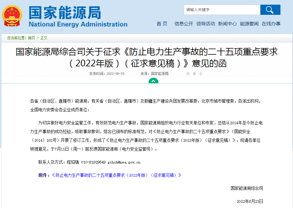 維科網鋰電注意到,早在2022年6月29日,國家能源局官方網站已發布“國家能源局綜合司關于征求《防止電力生產事故的二十五項重點要求(2022年版)(征求意見稿)》意見的函”。