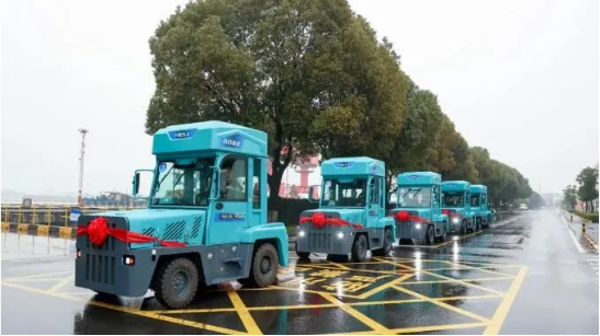 在張家港港務(wù)集團(tuán)港埠分公司倉庫內(nèi),5臺氫燃料港口專用牽引車一字排開,整齊壯觀。這些牽引車長3.8米、寬2米、高3米,屬于非道路移動(dòng)機(jī)械,主要用于港區(qū)內(nèi)件雜貨水平運(yùn)輸作業(yè)。它們的最大牽引載重量可達(dá)60噸,在氫瓶充滿的情況下可至少連續(xù)運(yùn)行8小時(shí),還擁有噪音低、操作舒適等特點(diǎn),其排放物為純凈水并采用一鍵自動(dòng)排水設(shè)計(jì)。
