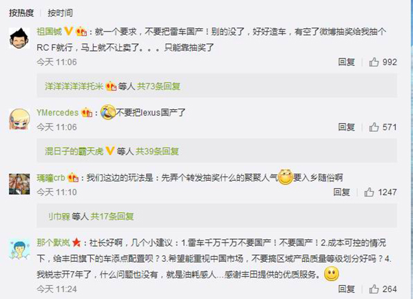 豐田中國相關負責人認為,面對現在網友請求不要國產雷克薩斯的聲音,換個角度來說也是對于進口雷克薩斯品質的認可。“這是仁者見仁、智者見智的事,這個微博開設的目的也是希望能夠獲得更多來自中國消費者的聲音。”