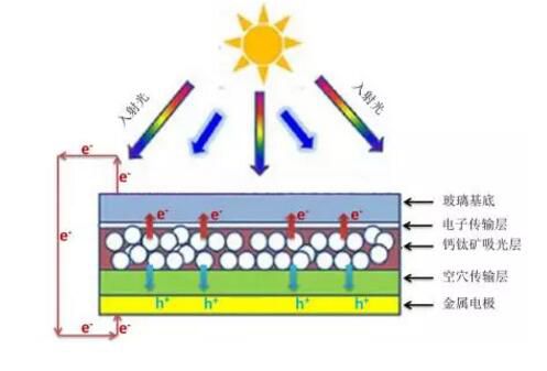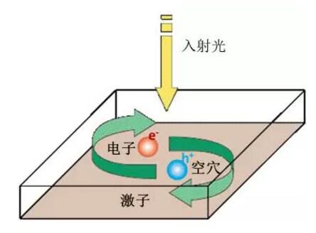 鈣鈦礦太陽能電池由導電電極、鈣鈦礦吸光層、電荷(電子和空穴)傳輸層組成。當太陽光入射到電池吸光層后隨即被吸收,光子的能量將原來束縛在原子核周圍的電子激發。由于物質整體上必須保持電中性,電子被激發后就會同時產生一個額外的帶正電的對應物,物理學上將其叫做空穴。這樣的一個“電子--空穴對”就是科學家們常說的“激子”。