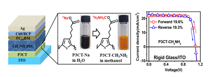 傳統的晶硅太陽能電池光電轉換效率大約介于23%至25%之間。在研究中,方俊鋒團隊采用一種有機材料——具有羧基極性基團的聚噻吩衍生物(P3CT)作為空穴傳輸層,可實現16%以上的光伏轉換效率。方俊鋒說:“在研究中,我們發現極性羧基的引入讓鈣鈦礦溶液在空穴傳輸層上更容易鋪展,通過抗衡離子調控使得空穴傳輸層界面薄膜更加均勻,效率可從16%進一步提高到19%以上。”