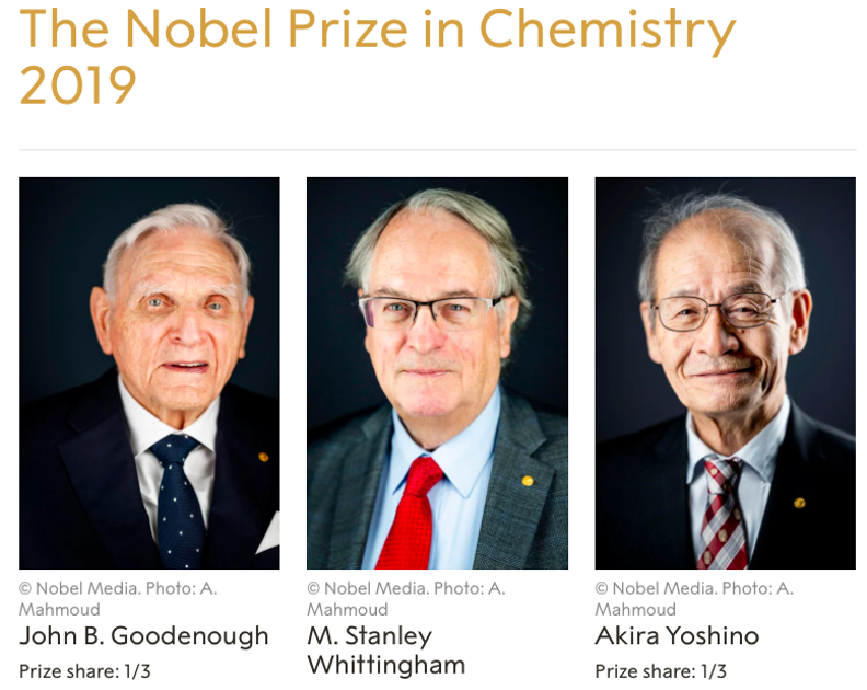 10月9日,瑞典皇家科學(xué)院宣布,將2019年諾貝爾化學(xué)獎授予來自美國的科學(xué)家約翰·古迪納夫、斯坦利·惠廷厄姆和日本科學(xué)家吉野彰,以表彰他們在鋰離子電池研發(fā)領(lǐng)域作出的貢獻。