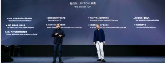 9月7日,FMC在上海發布了品牌英文名BYTON,中文名音譯為“拜騰”。BYTON是Bytes on Wheels的縮寫,其中byte(字節)代表互聯網和數字技術,wheel(車輪)代表傳統汽車,合二為一的BYTON意味著這兩個世界的融合,體現出FMC鏈接汽車工業與數字科技的理念與決心。