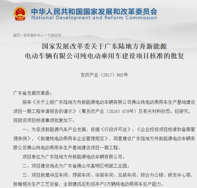 2017年5月18日,從國家發展改革委網站獲悉,國家發展改革委正式公示關于廣東陸地方舟新能源