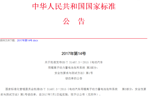 國家標準化管理委員會批準GB/T 31467.3-2015《電動汽車用鋰離子動力蓄電池包和系統 第3部分:安全性要求與測試方法》第1號修改單,自2017年7月1日起實施,現予以公布(見附件)。