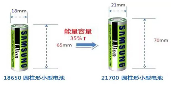 在此種背景下,業(yè)界認為,18650電池已完成了動力鋰電池初級應用階段的歷史使命,為了能夠達到政府規(guī)劃的目標,未來更大尺寸、更大容量的鋰電池型號將會興起,比如21700電池。